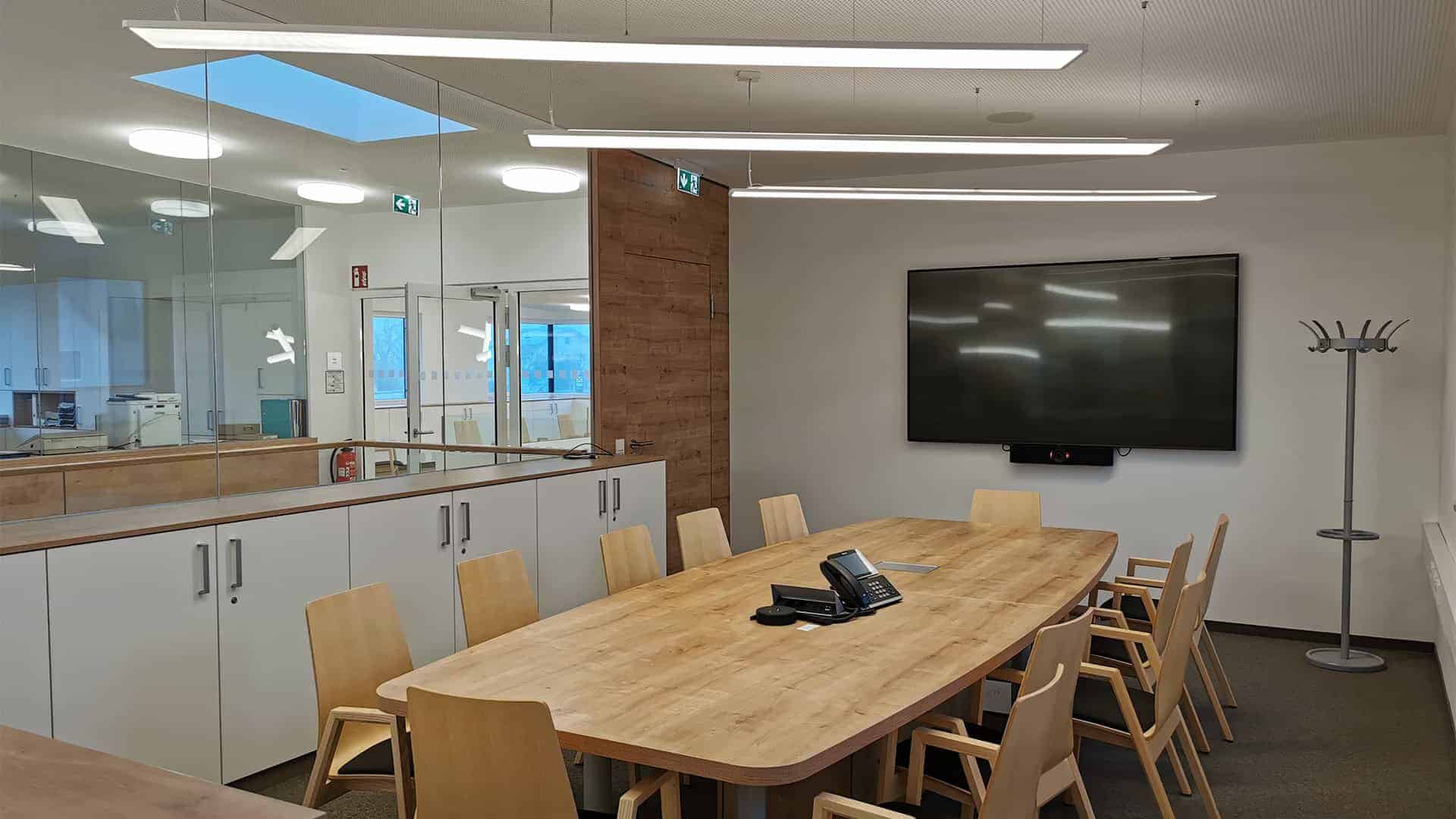 Besprechungsräume und Sitzungsbereiche wurden mit moderner Medientechnik ausgestattet. So sind Präsentationen, hybride Meetings oder Schulungen professionell umsetzbar.